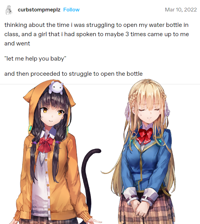 she's also in a bit of an odd space on the relationships front? she's hooking up with march 7, who insists that's just a thing friends do, and she's also got the world's most obvious crush on astarion, who is sort of de facto living in her room. and also sucking her blood regularly. it's fine! it's normal for girls. don't worry about it.
